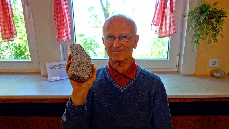 Für Ihn war es eine Überraschung, als seine ehemaligen Studienfreunde am 06.Oktober 2018 bei einem Treffen zum Mittagessen auf "unseren" Jenzig einluden. Es war für ihn ein sehr bewegendes Ereignis, er hielt mit besonderer Freude den Gesteinsbrocken (Dauerleihgabe des Geologischen Institutes Jena) aus unserer Vitrine in der Hand.