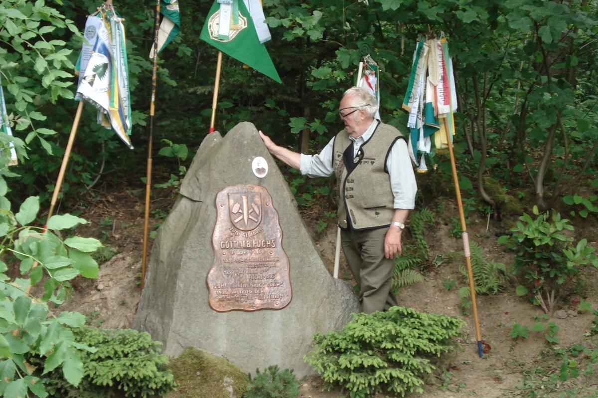 Der Vereins-Schultheiß Herr Joachim Häfner vor dem neuen Denkmal des Gottlieb Fuchs, Gründer des "Fuchsbaues"
