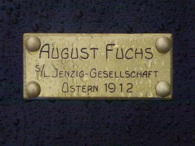 Gestiftet von August Fuchs, Eintritt in die Jenzig-Gesellschaft 1909, Aufstellung seiner Bank zu Ostern 1912, sie ist heute die älteste Bank am Wanderweg. Erneuert wurde sie im Mai 2013 durch dessen Sohn Siegfried unter Mithilfe seines Freundes Klaus Töpfer. Siegfried und Klaus sind beide Mitglied der Jenzig-Gesellschaft seit 1952 bzw. 1953, konnten also schon für das seltene 60.Jubiläum geehrt werden.