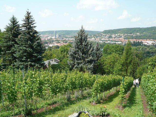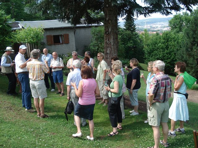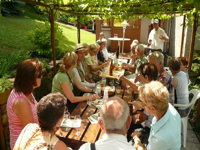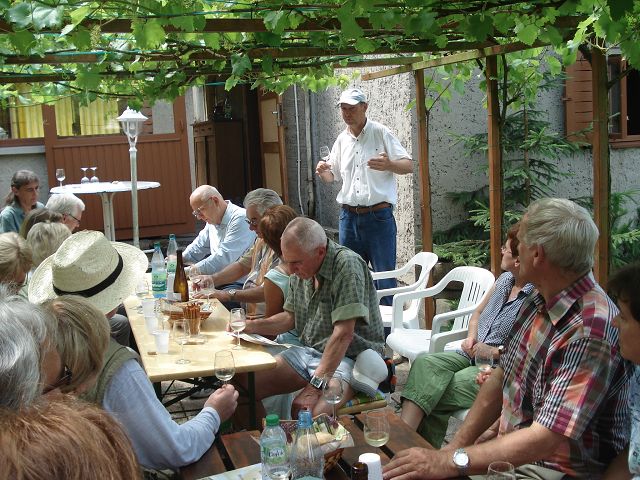Nach kurzer Wanderung erreichten wir die "heilige" Stätte unsereres Karstens am Südwesthang des Jenzig`s! Wir wurden von ihm und seiner Gattin herzlich begrüßt mit einem kühlen "Cabernet blanc" Spätlese trocken 2011 - ein wirklich guter Tropfen. Dann folgte die Weinbergbesichtigung mit fachkundigen Erläuterungen zum Anbau und Pflege der Reben. Daran schloß sich an die Verkostung weiterer zwei Weine -natürlich wurde der Gaumen zwischendurch "neutralisiert". Schnell vergingen knapp zwei Stunden, guter Dinge verließen wir das herrliche Grundstück. Herzlichen Dank dem Gastgeber für die wunderbare Führung ins liebliche Reich Bachus!
