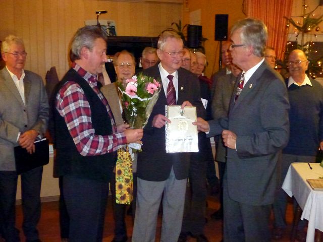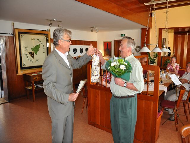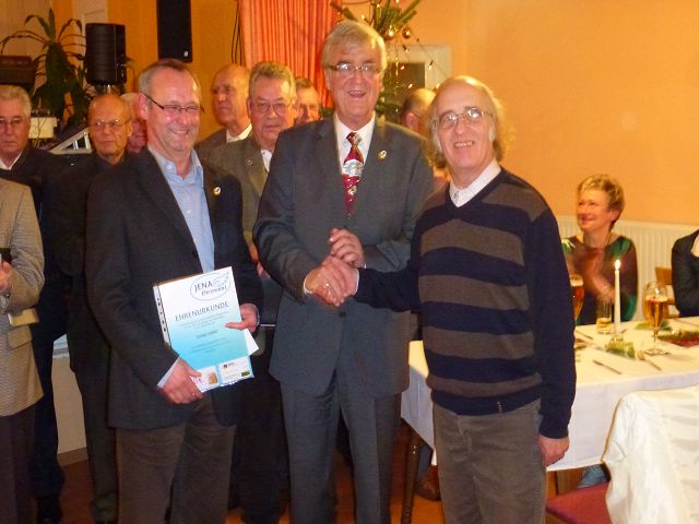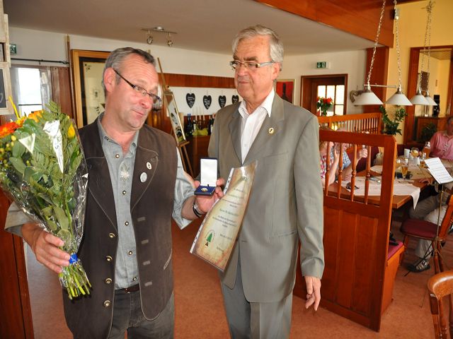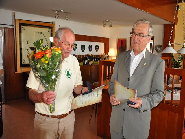 Dann erfolgte u.a. die Ehrung von Siegfied Fuchs für 60-jährige Mitgliedschaft, nochmals herzlichen Glückwunsch für die langjährige Treue! Mit der Verdienstnadel für aktive Arbeit im Sinne der Gesellschaft erhielten die Herren HansJoachim Ratzenberger und Mathias Richter, auch ihnen herzlichen Dank. Nach dem offiziellen Teil der Veranstaltung erfolgte eine würdige Andacht den verstorbenen Jenzigern vor dem Ehrenmal - wegen der Waldbrandstufe leider nicht mit Fackelschein auf der Pylonenschale.