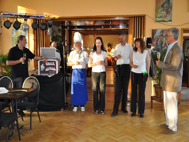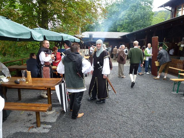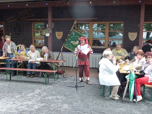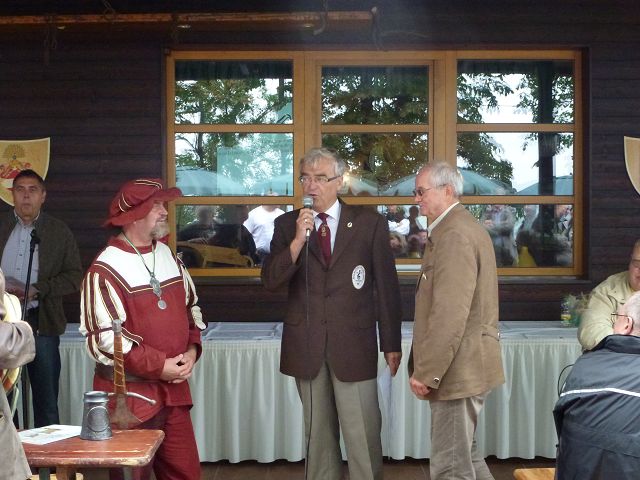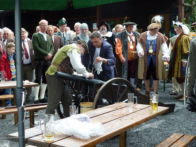 Punkt 11.15 Uhr eröffnete der Jenzig-Chor den Festakt - leider bei leichtem Nieselregen. Dann folgte die Jubiläumsansprache des Burgherrn HansJürgen Domin - 100 stolze Vereinsjahre liegen zurück. Dann die Weihe der neuen Kanone mit Böllerschüssen! Ein tolles Ereigniss für die Anwesenden. Nach dem offiziellen Gratulationsreigen dann zwangloses Miteinander und gegen 15.00 Uhr dann Kaffe und Kuchen, spendiert von den Wirtsleuten und den Gastgebern.