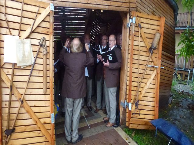 Der Jenzig-Chor wurde von den Wirtsleuten zu einem Konzert eingeladen, leider bei Bindfadenregen fand das Ganze in der wunderschönen "Lindwurm" statt, darin war es natürlich für die erschienen 24 Sänger + Dirigent etwas eng und die erwartete Zuhörerschaft entsprechend klein. Dennoch erlebten wir ein paar nette Stunden bei süffigem Wein (Kraftfahrer etwas weniger!).