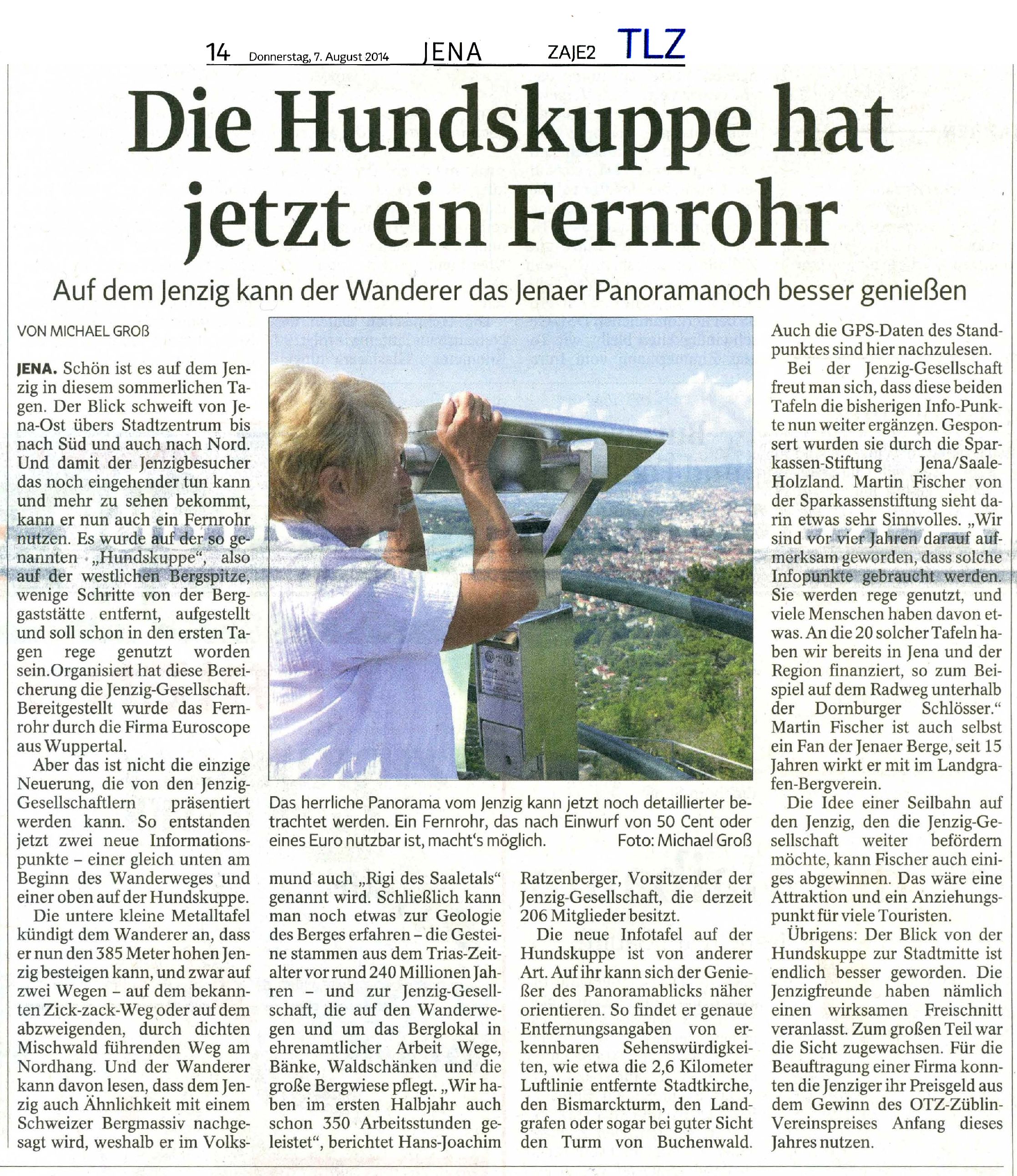 Wie auf die TLZ berichtet, wurden am 6. August die Infotafel am Fuße des Jenzig-Weges und die Wegweise-Tafel am östlichen Ende des Jenzig, der Hundskuppe von Herrn Martin Fischer als Sponsor eingeweiht und das neue Münz-Fernrohr angeschaut.