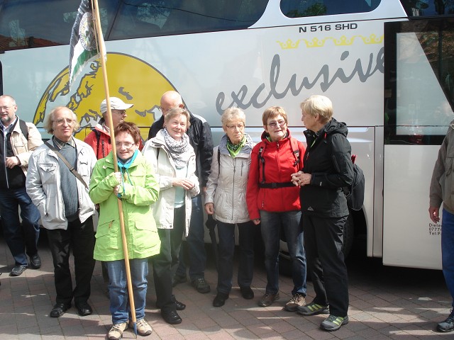 am Autohaus mit Wanderleiter Mathias bei strahlendem Sonnenschein.