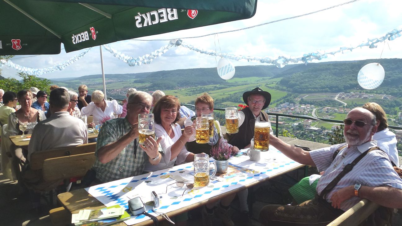 Trotz regnerischem Wetter fasste die Vereinshütte kaum die angereisten Nachbarn im idyllischer Waldlage. Es herrschte gute Laune und bei toller Musi, bester gastronomische Umrahmung ka- me alle auf ihre Kosten. Herzliche Gratulationen den Gastgebern zum 90.Vereinsjubiläum, wir neun Jenziger überreichten unser Jubiläumsbuch mit besten Wünschen. Ein neues Wimpelband erinnert nun an ein gelungenes Treffen.