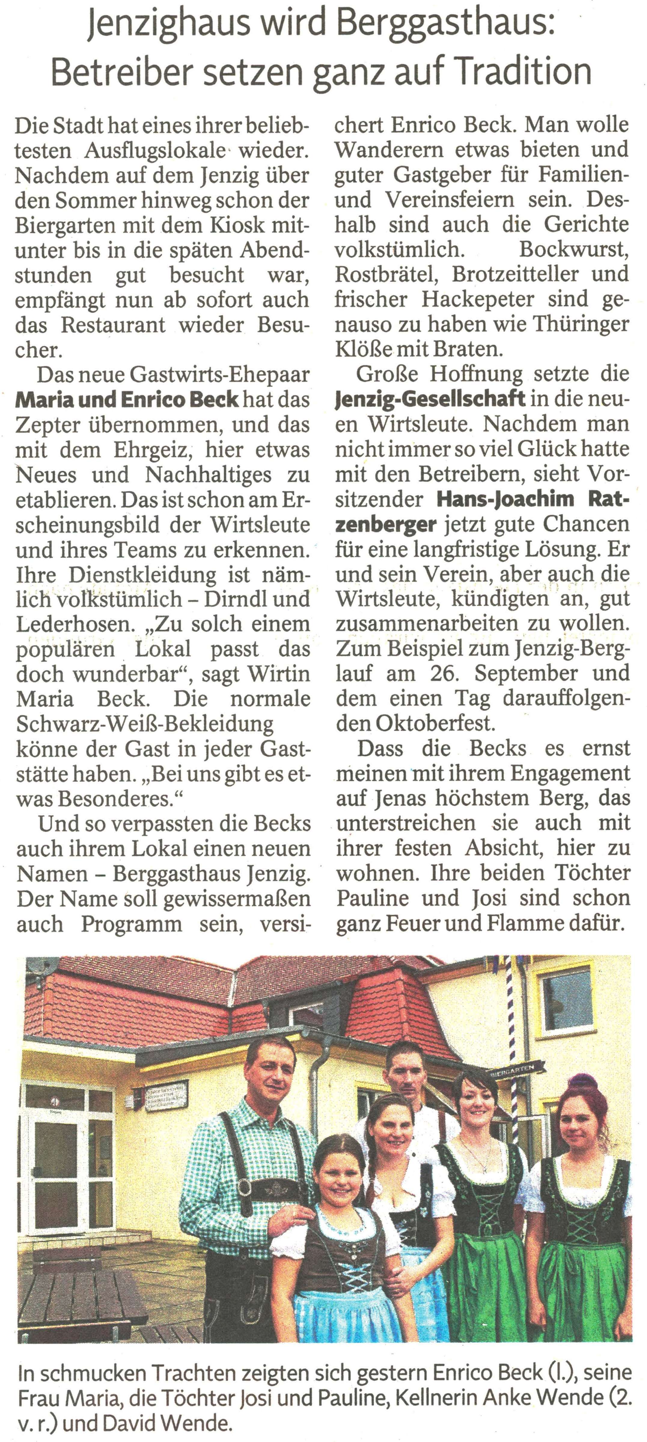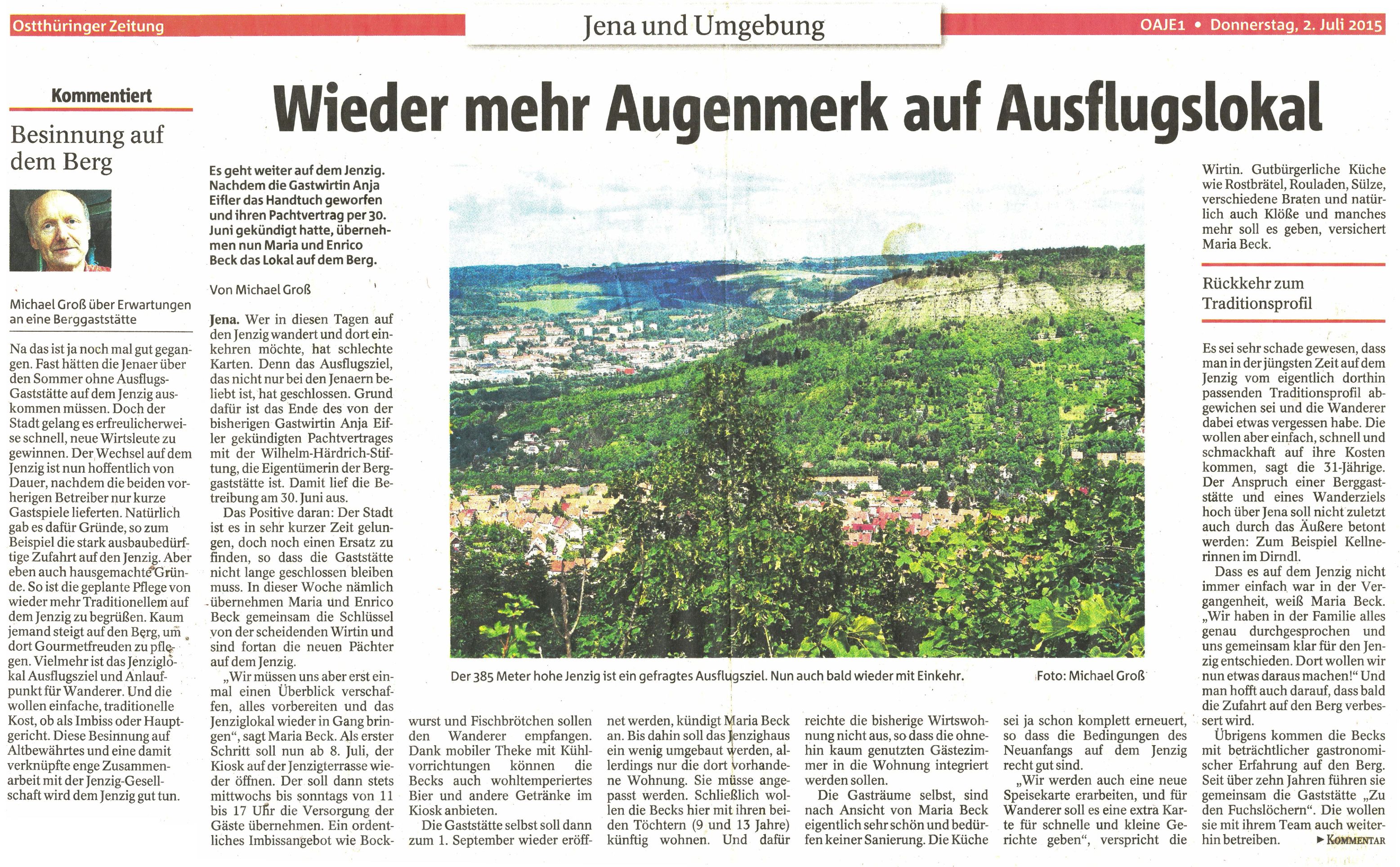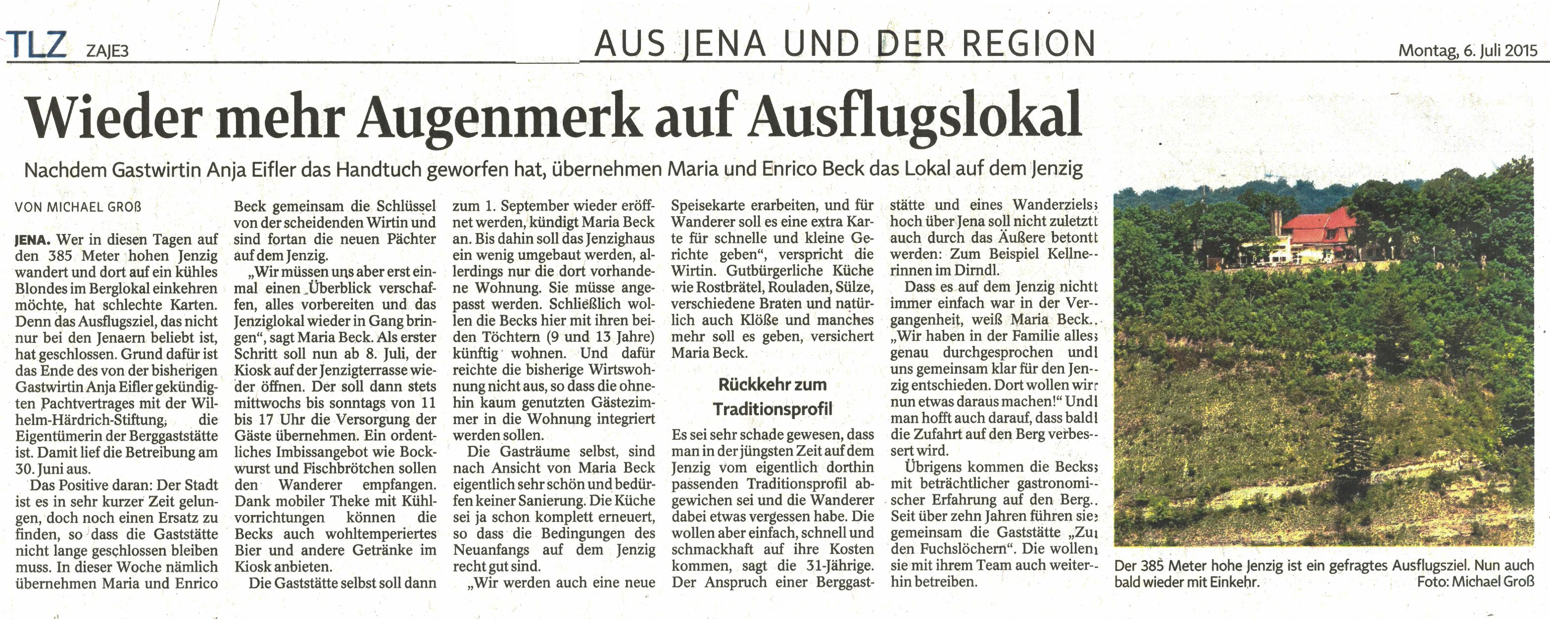 Thüringer Landeszeitung vom 29.08. 2015: "Jenzighaus wird Berggasthaus"