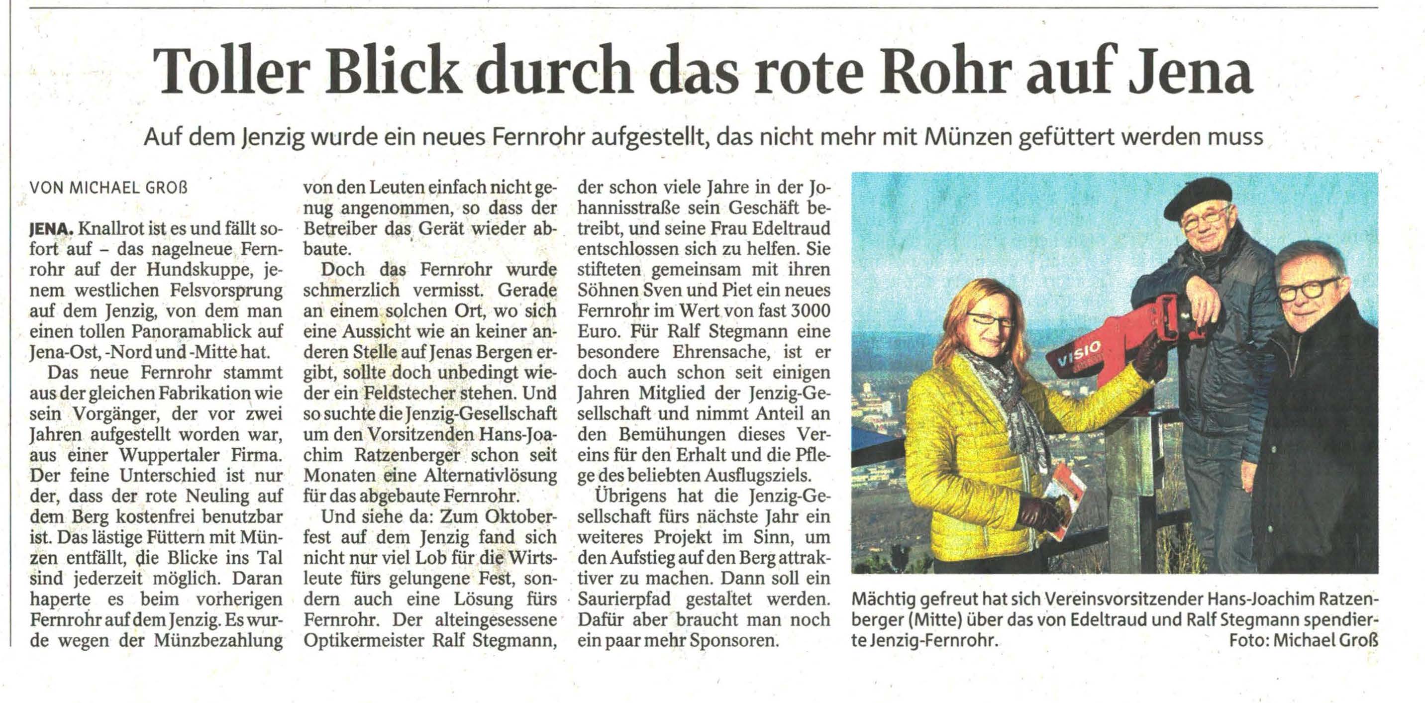 Zur Feierlichen Übergabe des von Familie Stegmann gestifteten Fernrohres gab es in der TLZ/OTZ folgenden Artikel: