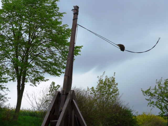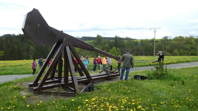 Auch der Abschuss einer ca. 15 kg schweren Steinkugel mit der historischen Bliden-Burg-Belagerungswurfmaschine wurde uns vom Heimatverein vorgeführt - ein tolles Erlebnis!