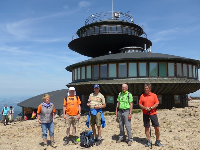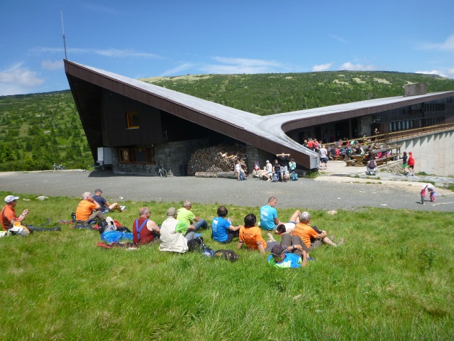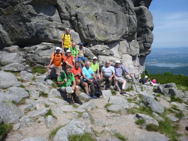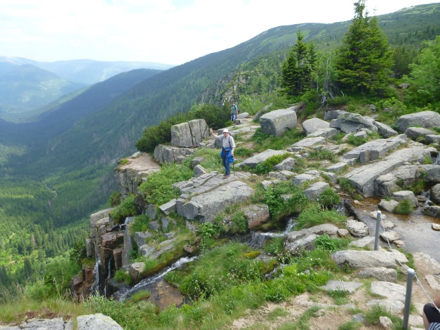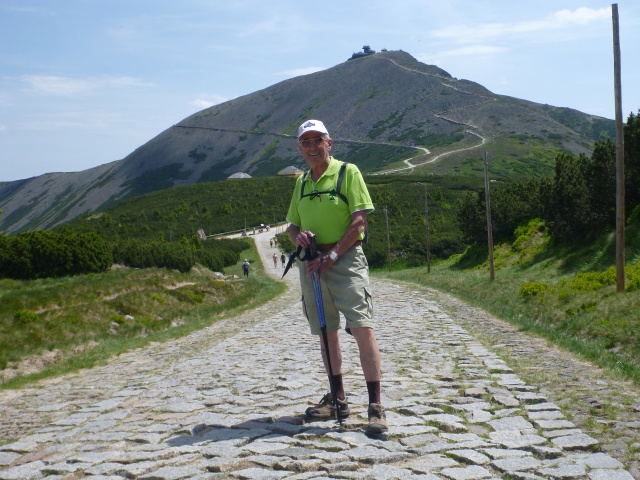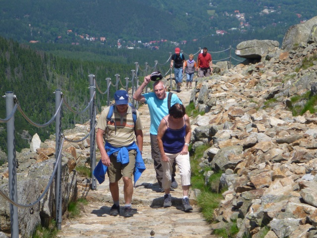Dieser Höhenweg bot herrliche Ausblicke in die Landschaft. mit kleinen Bergseen, Felsformationen und sogar Schneeresten. Die Sonne meinte es auch sehr gut mit uns, so dass wir richtig ins Schwitzen kamen. Im Schlesierhaus am Fuße der Schneekoppe stillten wir unseren Durst bevor der steile Aufstieg auf die Spitze begann. Hier auf dem Weg auch unser Senior Roland.