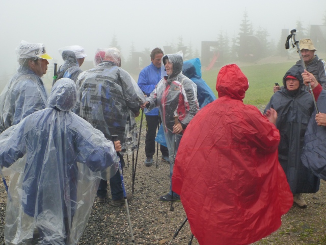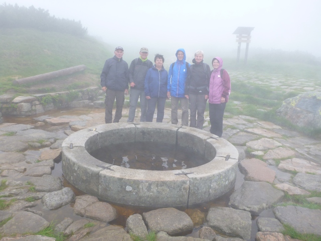Von der Landschaft war nicht viel zu sehen, sogar die Vorderleute konnte man nur durch die Farbe der Regenumhänge unterscheiden. So kam es, dass einige total durchnässt zum Lift zurückkehrten und im Tal eigene Ziele erwanderten. Bis zur Elbquelle (ein Betonbrunnenring stellt sie symbolisch dar, tatsächlich liegt sie einige Meter höher)