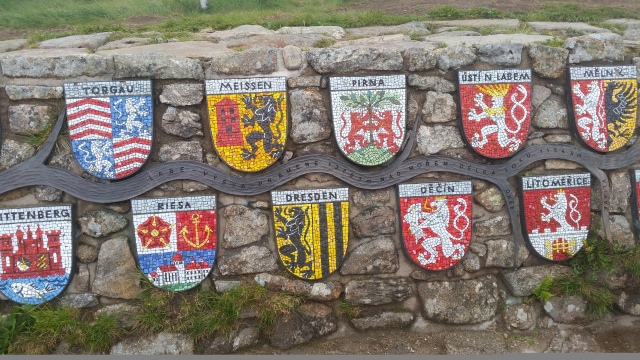 blieb es neblig, windig und nass. Am Rand sind die Wappen der Städte zu sehen, durch die die Elbe fließt, hier ein Ausschnitt (wegen des Nebels).