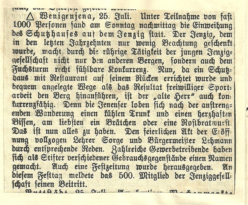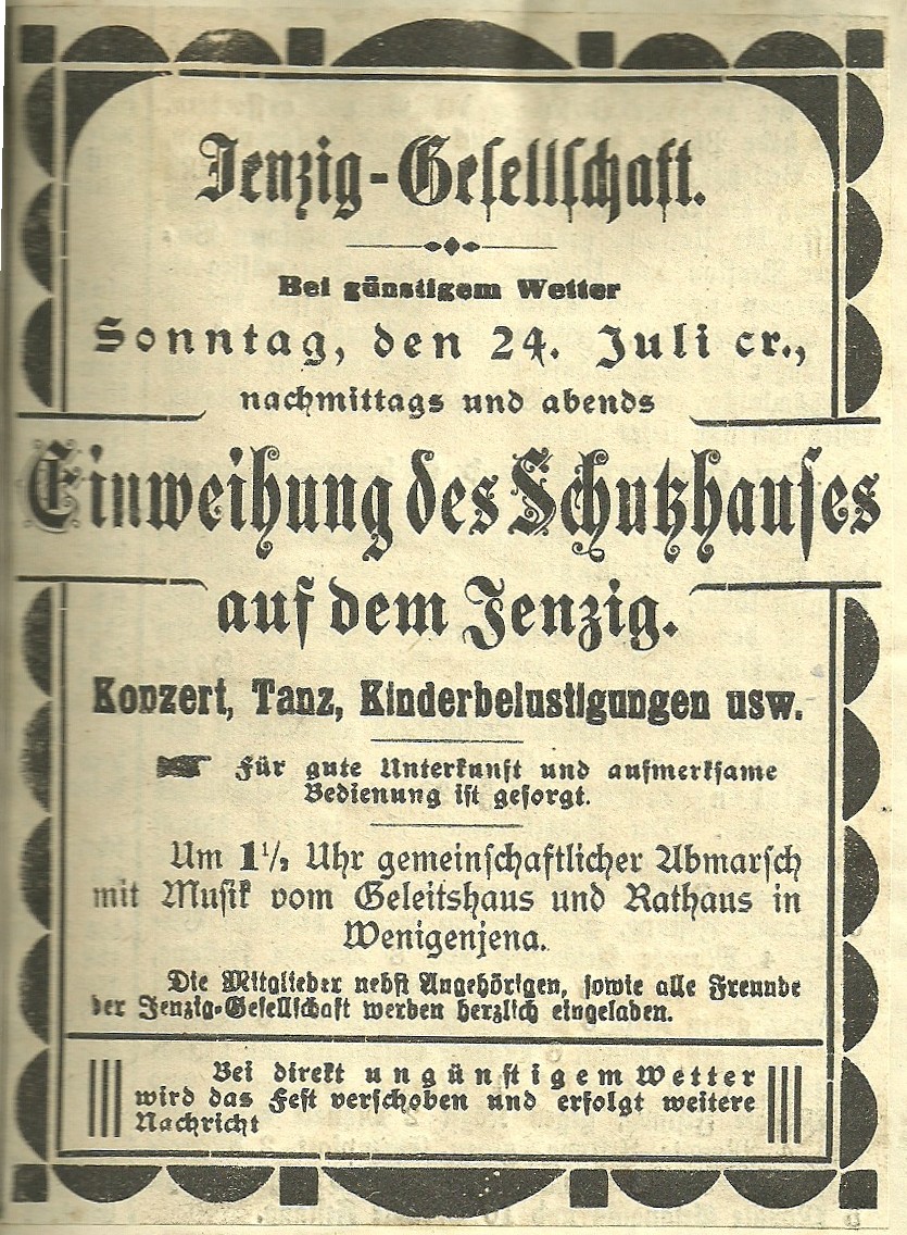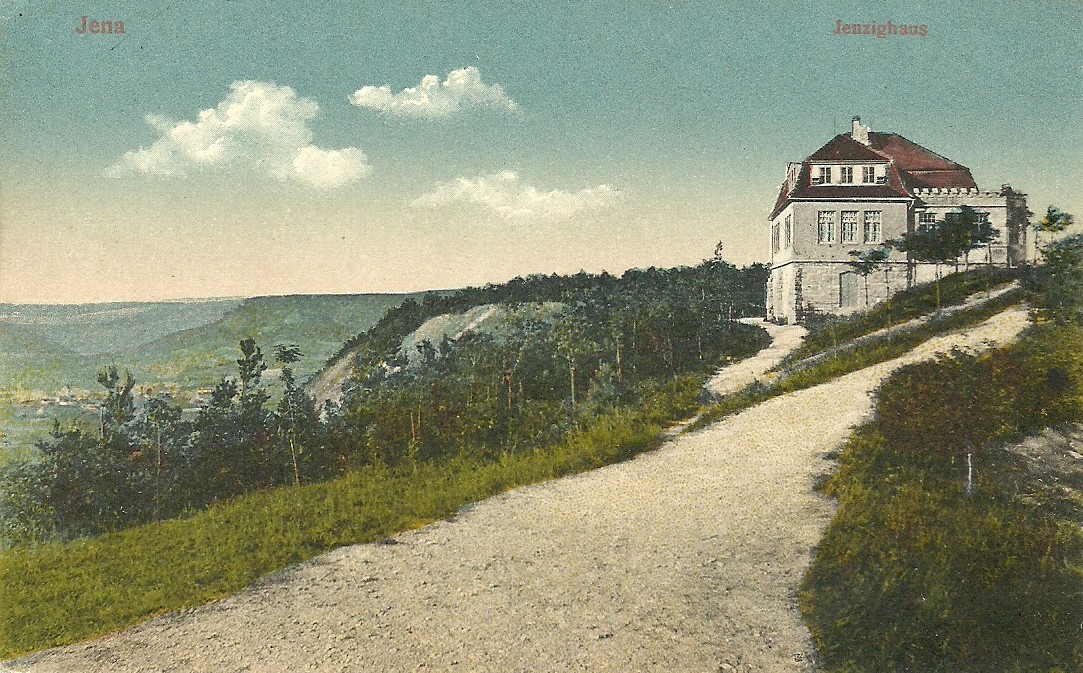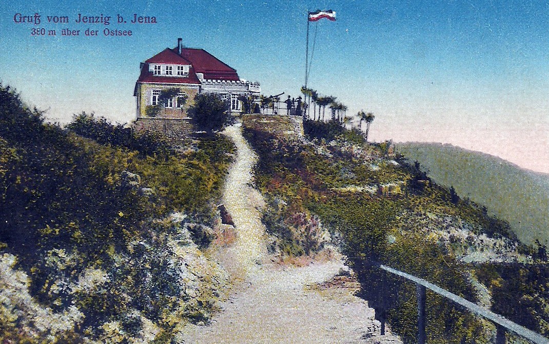 Hier begann alles! Am 16.05.1903 saß hier im "Altes Geleitshaus" (Abbruch ca.1910) an der Camsdorfer Brücke eine Stammtischrunde beim Ehringsdorfer Biere und beschloss, eine Gesellschaft zu begründen, die sich dem schönen Jenzig widmen sollte:
